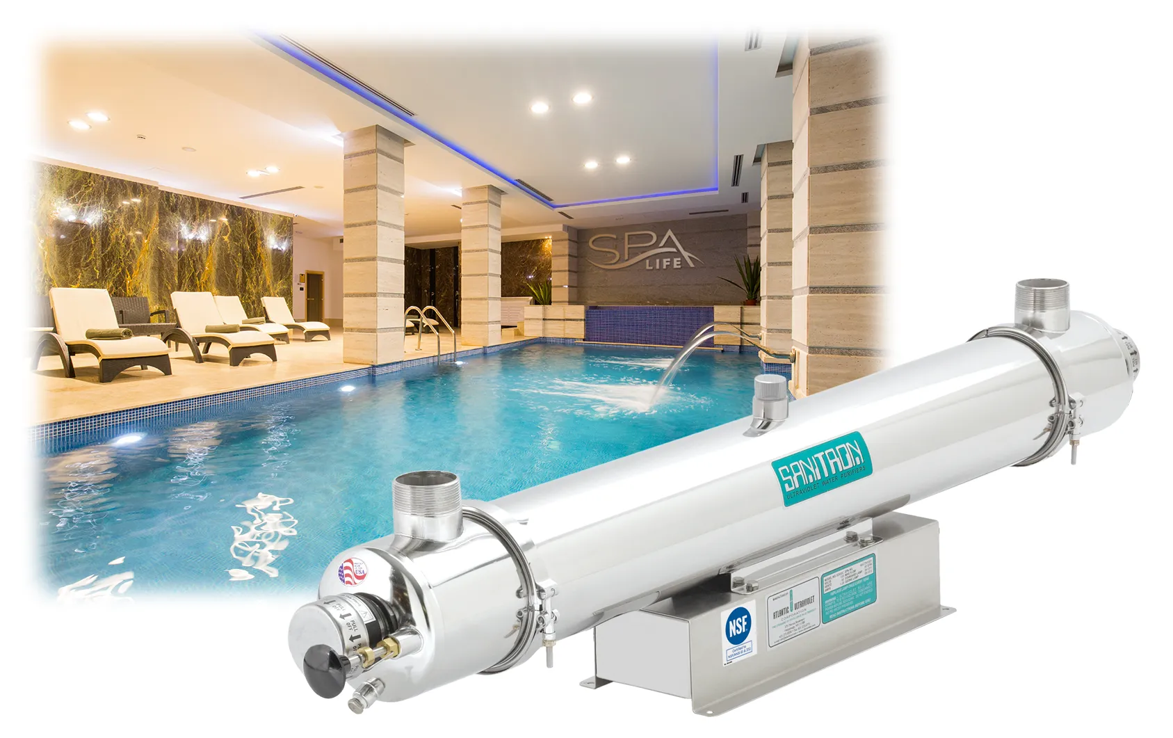 The Sanitron® UV-C water purifier line is well-featured, complete with a patented wiper system. Models install at the site of pools, hot tubs, or at the point of entry into a facility — perfect for the needs of salons, health spas, and medical spas. Model S2400C treats 40 gallons per minute and can be connected in series to disinfect larger water flows.